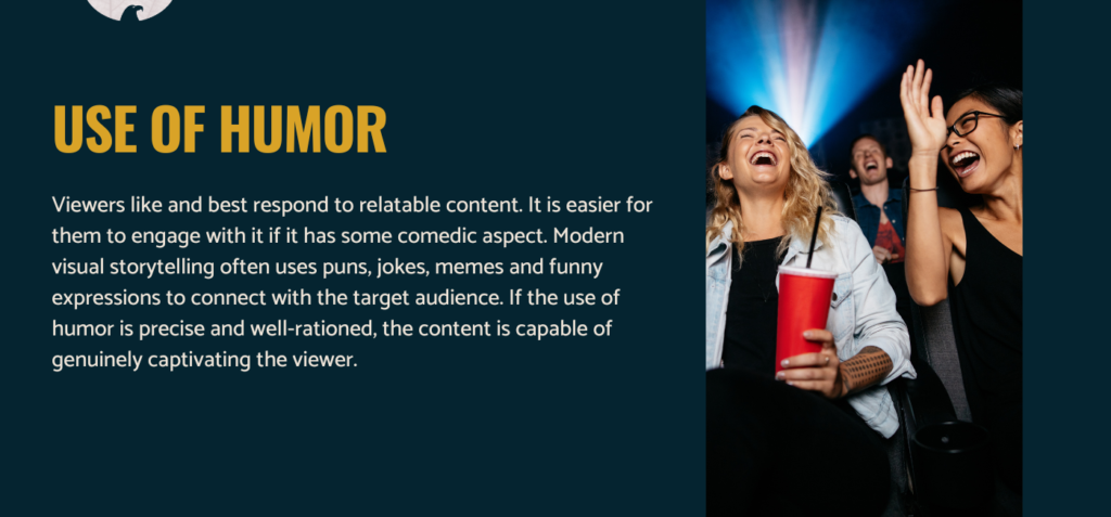 Viewers like and best respond to relatable content. It is easier for them to engage with it if it has some comedic aspect. Modern visual storytelling often uses puns, jokes, memes and funny expressions to connect with the target audience. If the use of humor is precise and well-rationed, the content is capable of genuinely captivating the viewer.